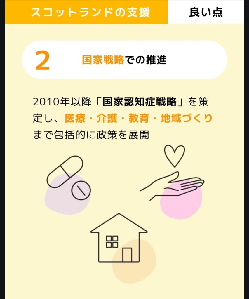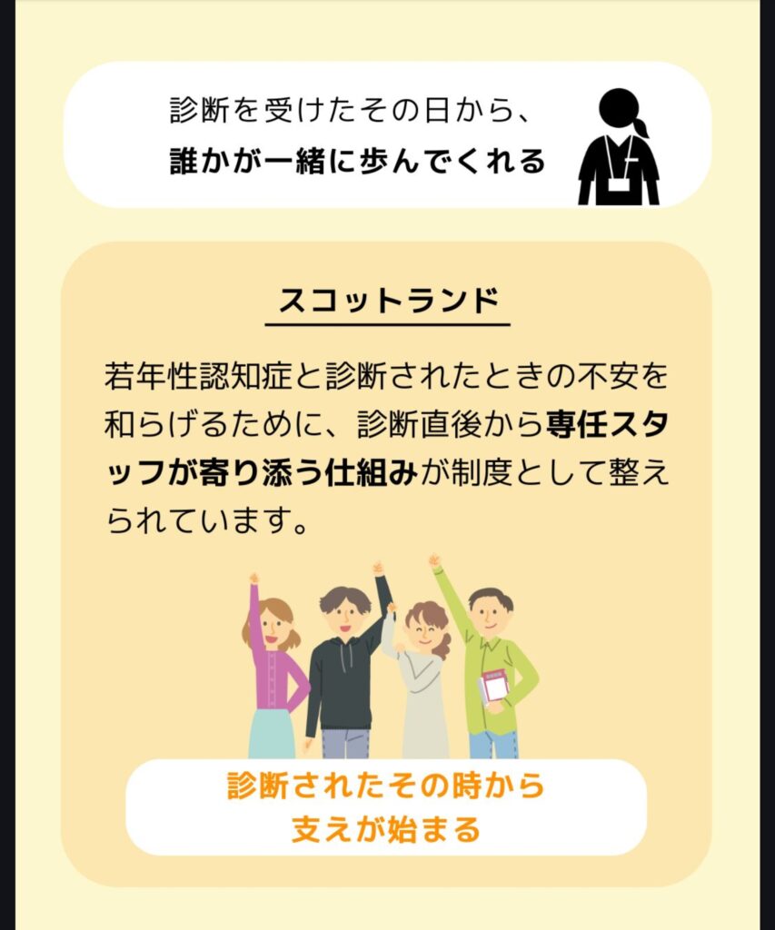 日本では「診断 → 介護保険申請 → サービス利用」という流れが多いですが、スコットランドの取り組みには「診断されたその時から支えが始まる」ヒントがたくさんあります。