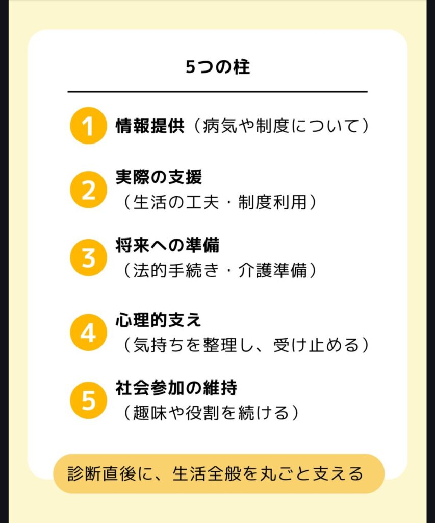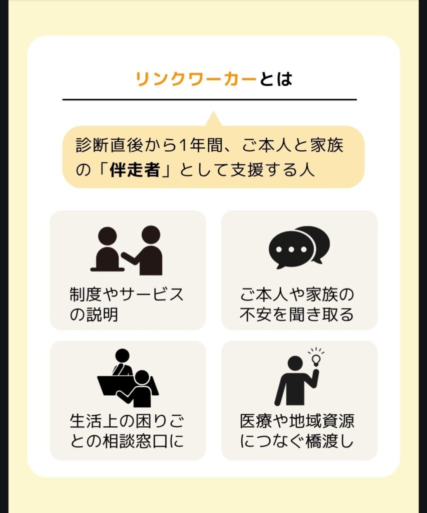 - 役割:診断直後から1年間、ご本人と家族の「伴走者」として支援。