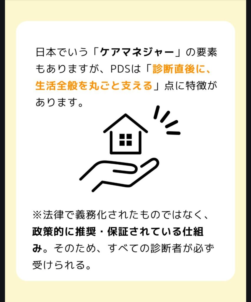 日本でいう「ケアマネジャー」の要素もありますが、PDSは 「診断直後に、生活全般を丸ごと支える」点に特徴があります。