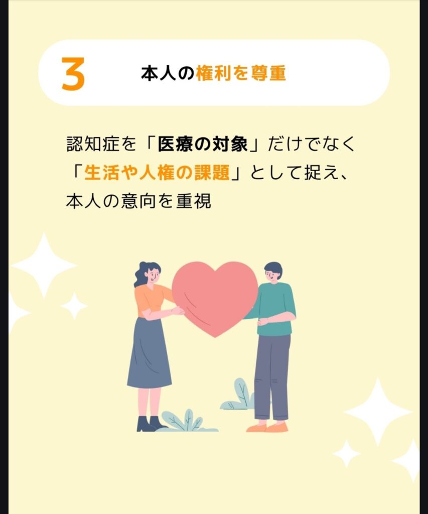 本人の権利を尊重 | 認知症を「医療の対象」だけでなく「生活や人権の課題」として捉え、本人の意向を重視。 |