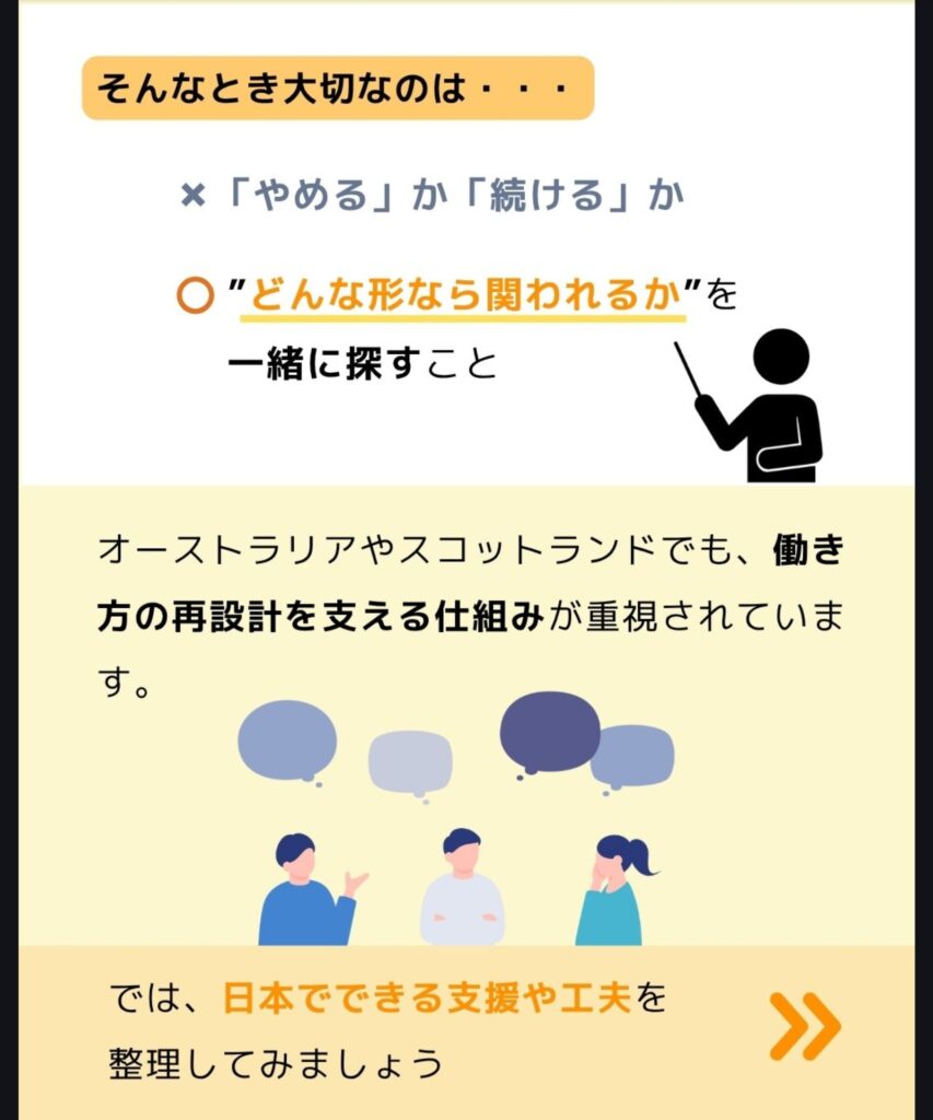 ポイント:「完全に仕事を手放す」のではなく、〝支援付きで働ける場〟を見つけることが再出発の一歩。