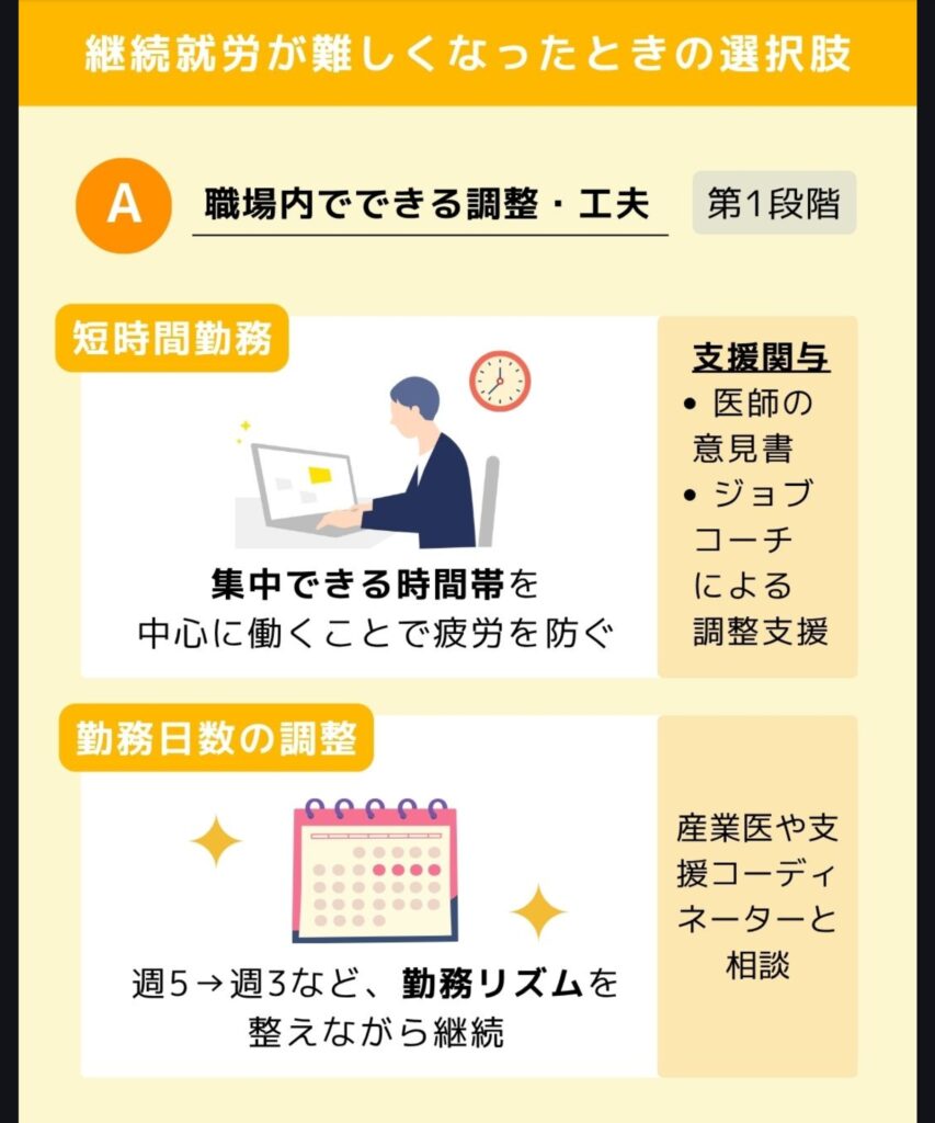 | 勤務日数の調整 | 週5→週3など、勤務リズムを整えながら継続 | 産業医や支援コーディネーターと相談 |