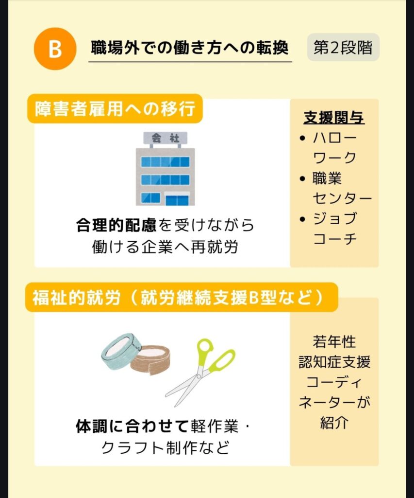 | 障害者雇用への移行 | 合理的配慮を受けながら働ける企業へ再就労 | ハローワーク・職業センター・ジョブコーチ |