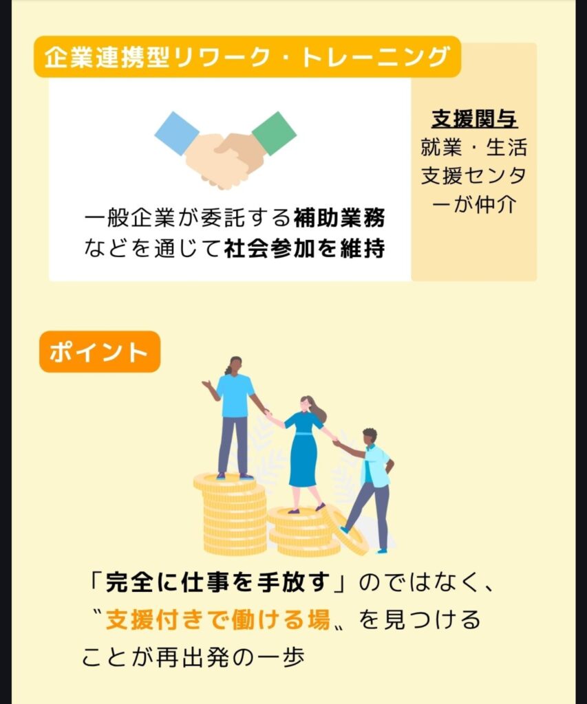 | 企業連携型リワーク・トレーニング | 一般企業が委託する補助業務などを通じて社会参加を維持 | 就業・生活支援センターが仲介 |