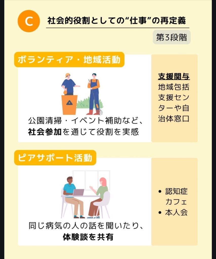 | 福祉的就労(就労継続支援B型など) | 体調に合わせて軽作業・クラフト制作など | 若年性認知症支援コーディネーターが紹介 |