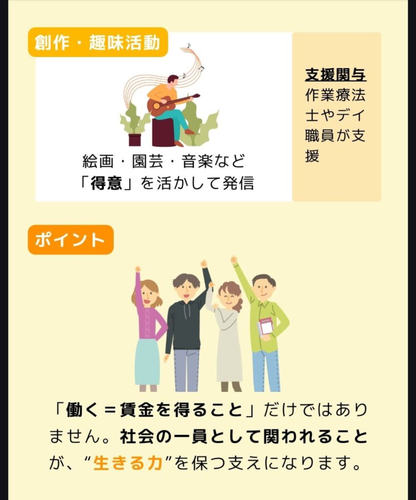 | 創作・趣味活動 | 絵画・園芸・音楽など「得意」を活かして発信 | 作業療法士やデイ職員が支援 |