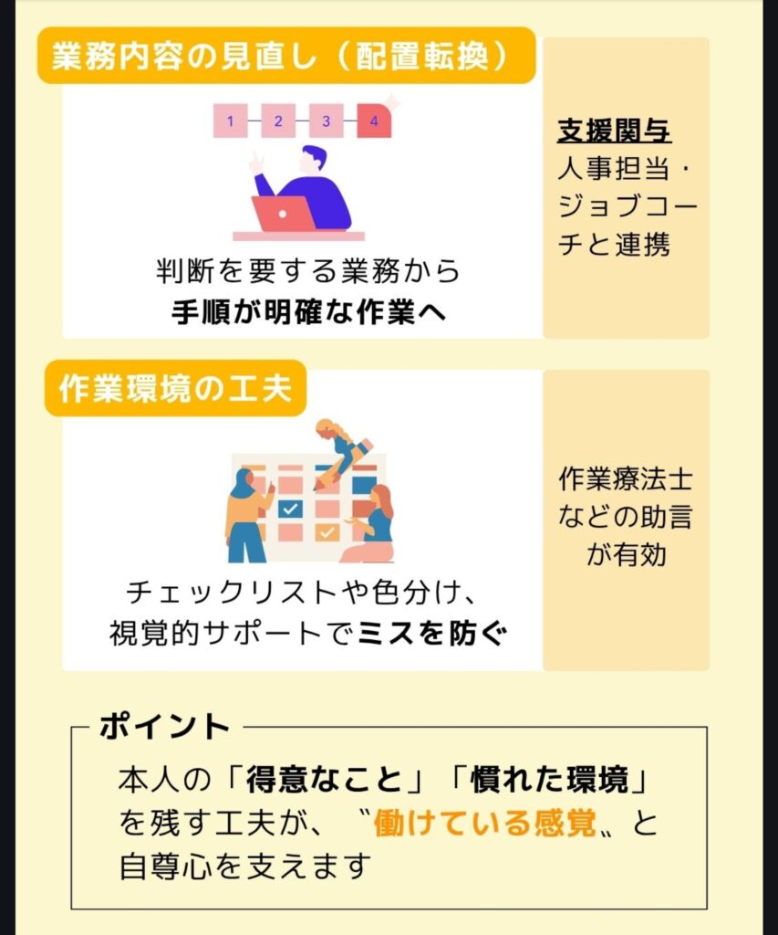 | 業務内容の見直し(配置転換) | 判断を要する業務から手順が明確な作業へ(例:営業→資料整理) | 人事担当・ジョブコーチと連携 |