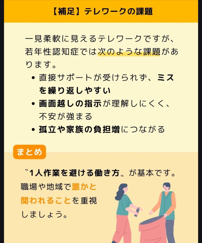 一見柔軟に見えるテレワークですが、若年性認知症では次のような課題があります。