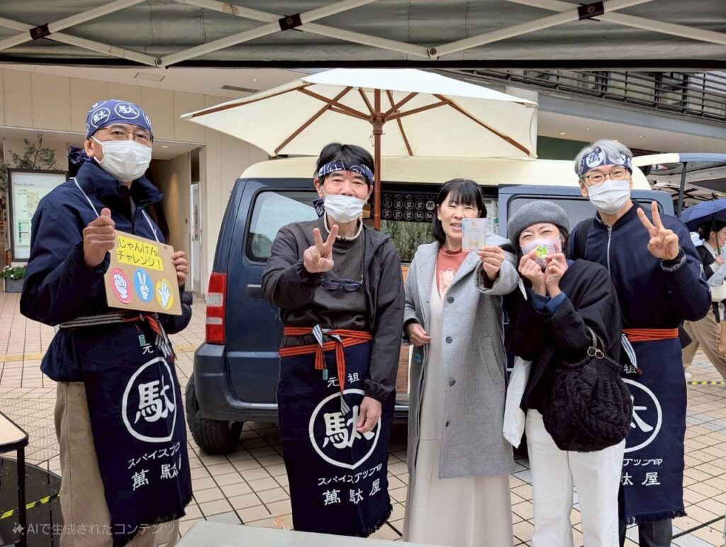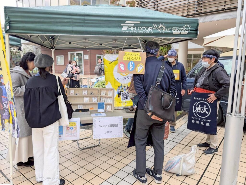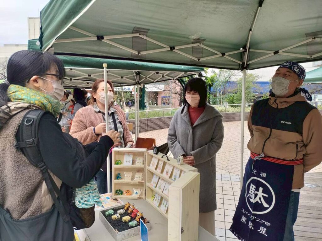 たまプラ―ザ駅前で行われる『福の市』に今年も萬駄屋さんと一緒に参加することができました。この場所で開催するようになって3年目となりますが、今年は我々のほかにも、「コラボ販売ゾーン」として、地元企業さんと福祉作業所が一緒のスペースで出店するなど、小雨にも関わらず一層の賑わいを感じるイベントとなりました。