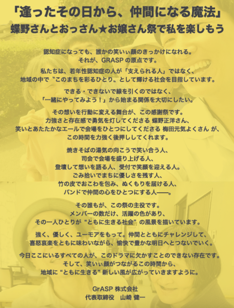 最後に感謝祭で伝えたかった想い、リーフレットにまとめていますがこちらを改めてご案内して、『認知症フレンドリーシティ神奈川横浜×GRASP感謝祭 蝶野さんとおっさん★お嬢さん祭 仲間に感謝 出会いに乾杯』を締めくくります。