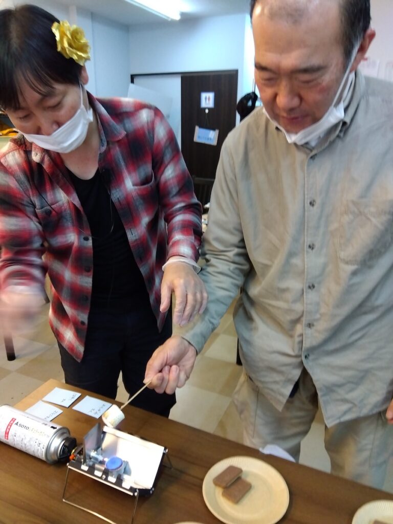 火でマシュマロをあぶってトロトロになった所でチョコレートがついているビスケットでサンドするお手軽おやつです。しかし、マシュマロを火に近づけすぎると勢いよく燃えてしまうので集中力が必要な作業でした。