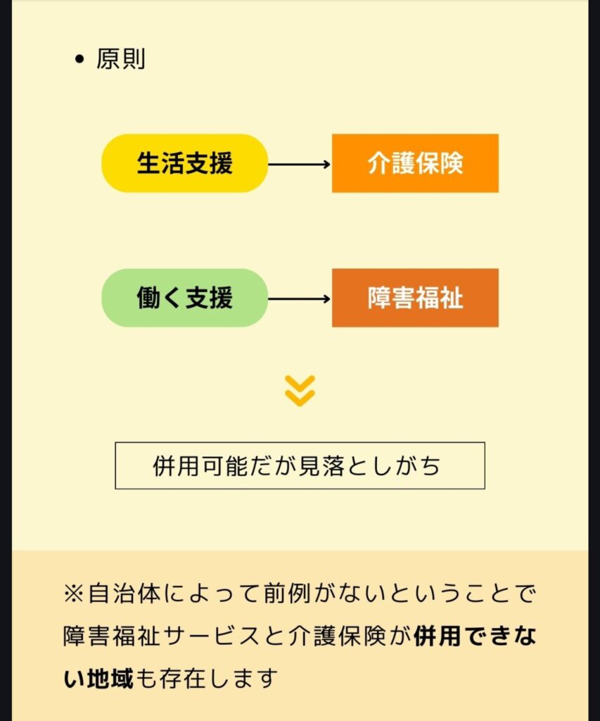 ►原則「生活支援は介護保険」、「働く支援は障害福祉」と分けると理解しやすいです。併用可能ですが、見落としがちです※自治体によって前例がないということで障害福祉サービスと介護保険が併用できない地域も存在します。