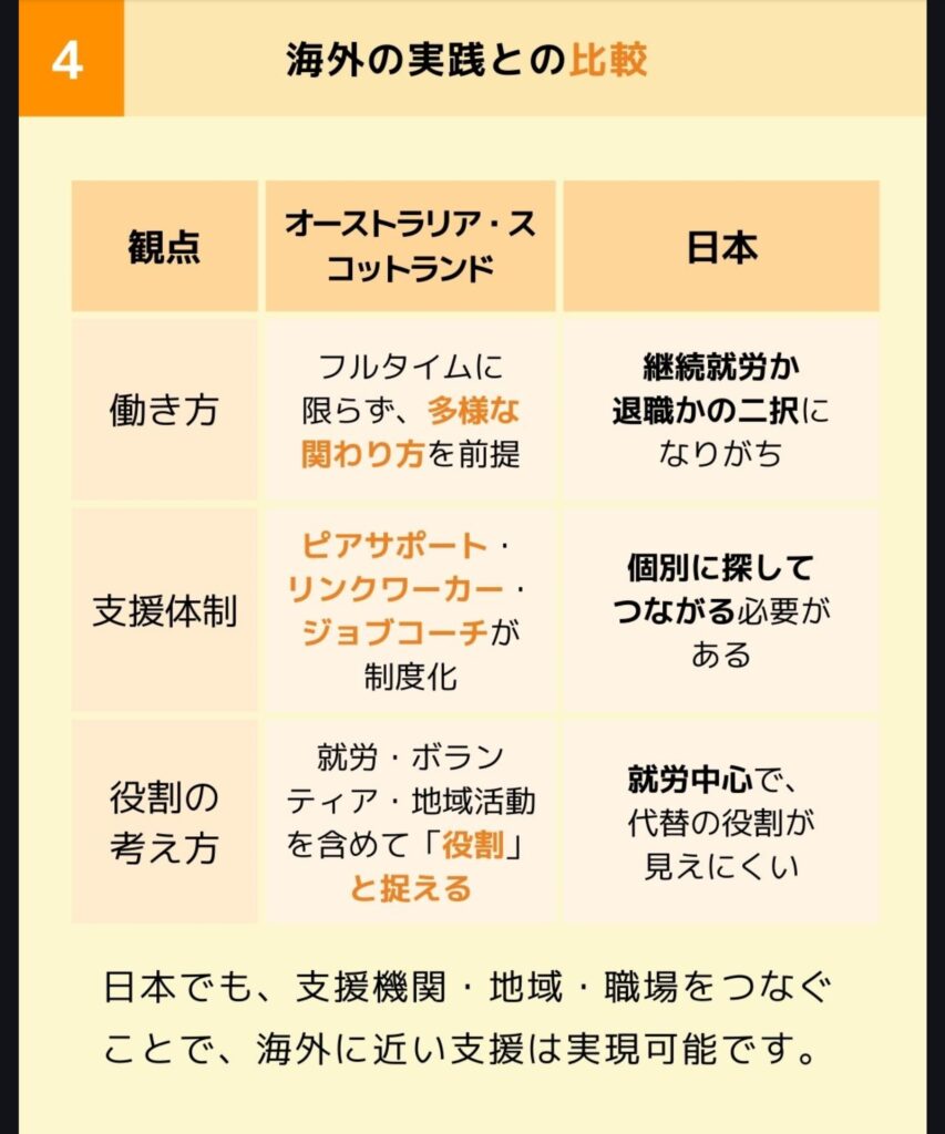 | 支援体制 | ピアサポート・リンクワーカー・ジョブコーチが制度化 | 個別に探してつながる必要がある |