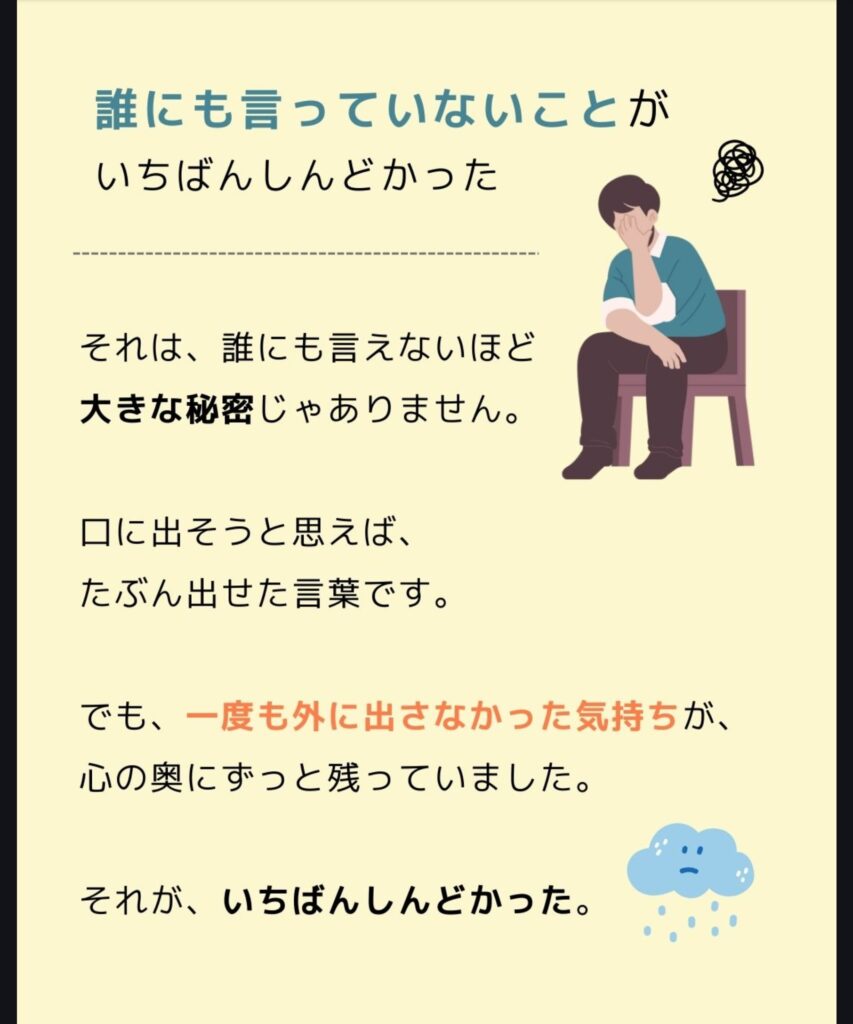 「誰にも言ってないこと」が、一番しんどかった。こんな考え方が他にもあります、現在活用中です、最新のデータから読み解くとこうなります。等、みなさまからの情報がありましたら教えてもらえるとうれしいです(^^♪