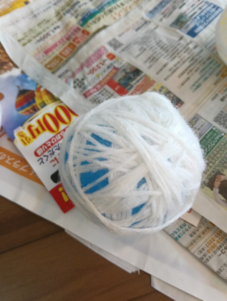 水風船をふくらましたら、紙皿に多量のボンドを水に溶かしておき、そこに毛糸を付けていきます。あとは水風船に毛糸を巻き付けていくだけです。
