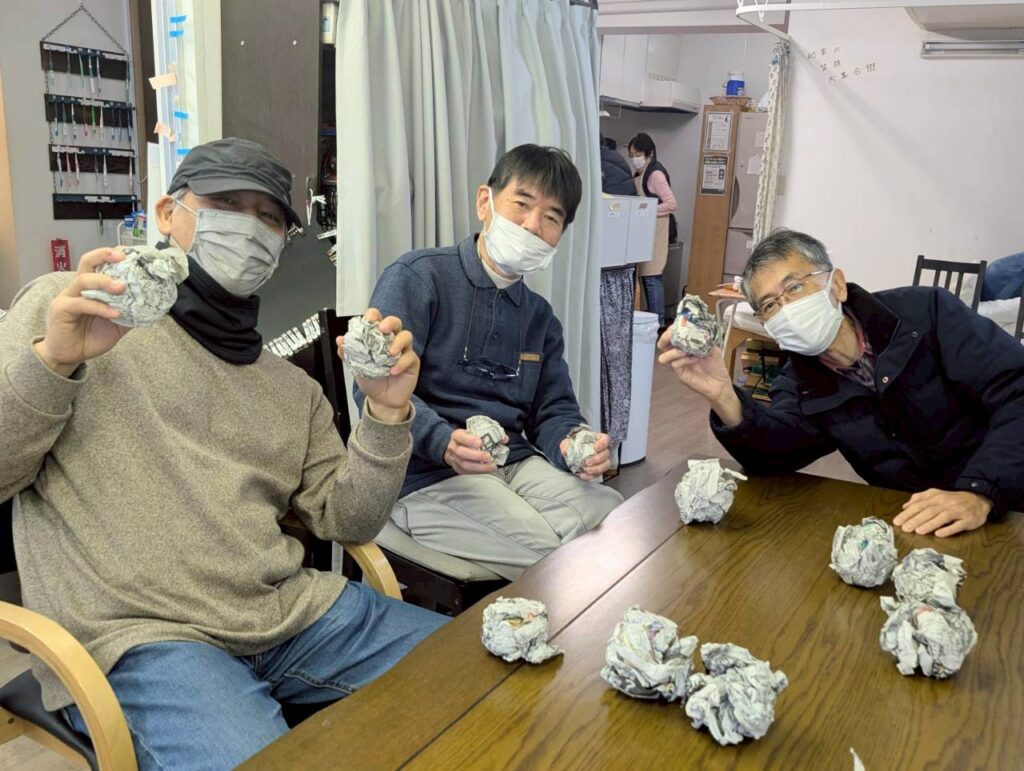 次は3匹の鬼が登場。豆に見立てた新聞紙の球を思いきり投げて鬼退治!のはずが…。