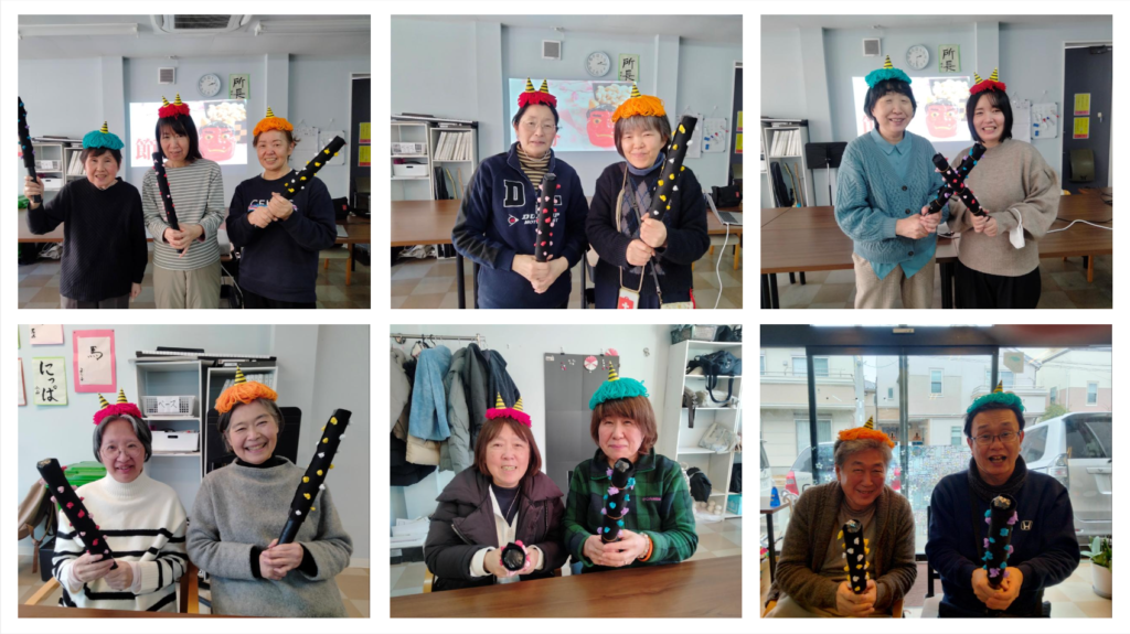鬼の角を付けて、こん棒を持って「鬼は外~!福は内~!」とポーズを取って記念撮影も行いました。