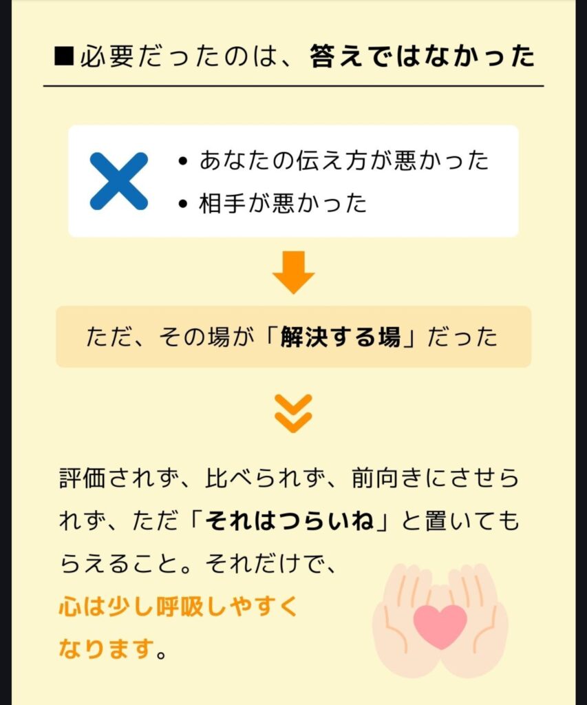 もし、相談しても楽にならなかった経験があるなら、それはあなたが間違っていたわけではありません。