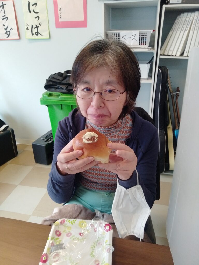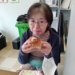 パン屋さんへ行くことをメンバーさんにお伝えすると、眠そうな目もランランと輝き『やったぁ』、『本当!』『イェーイ』など拍手などで盛り上がりました。お店に行くと『1つだけね』と説明しましたが、美味しそうなあまり2個3個持ってきては「1つですよ!」と言うと『ケチね』とこ『内緒で2つは?』などと、皆さんとのやり取りも楽しませて頂きました。自分選んでお金を払って好きなパンが買えたという思いからか、皆さんパンを手にしてた帰りはとても今まで見た事のない笑顔でいっぱいでした。