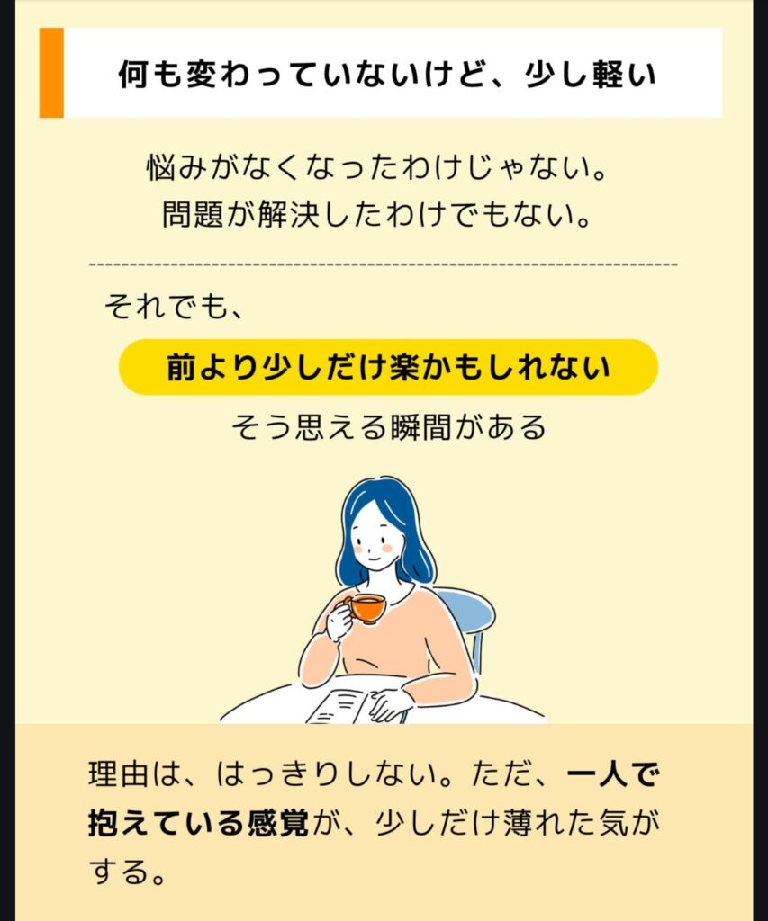 ただ、一人で抱えている感覚が、少しだけ薄れた気がする。